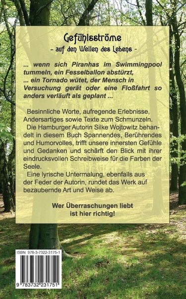 Besinnliche Worte, aufregende Erlebnisse, Andersartiges sowie Texte zum Schmunzeln -... ob sich Piranhas im Swimmingpool tummeln oder ein Fesselballon abstürzt, ob ein bedrohlicher Tornado naht, der Mensch in Versuchung gerät oder eine Floßfahrt so anders verläuft als geplant ... Silke Wojtowitz behandelt in diesem Buch Spannendes, Berührendes und Humorvolles, trifft unsere innersten Gefühle und Gedanken und schärft den Blick mit ihrer eindrucksvollen Schreibweise für die Farben der Seele.Diese Geschichten spiegeln in liebevoller, ja oft humorvoller Form, bunte Seelenbilder wieder, weisen auf Ungerechtigkeiten in der Gesellschaft hin und nehmen atemberaubende oder unvermutete Wendungen.Der Leser wird auf eine Reise in die Natur und der Gefühle geschickt, deren Faszinationen er sich nicht entziehen kann.Eine lyrische Untermalung, ebenfalls aus der Feder der Autorin, rundet das Werk auf bezaubernde Art und Weise ab.Wer Überraschungen liebt, ist hier richtig!