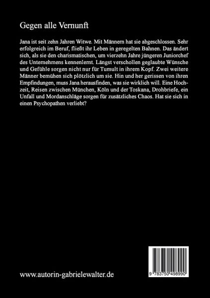 Jana ist seit zehn Jahren Witwe. Mit Männern hat sie abgeschlossen. Sehr erfolgreich im Beruf, fließt ihr Leben in geregelten Bahnen. Das ändert sich, als sie den charismatischen, um vierzehn Jahre jüngeren Juniorchef des Unternehmens kennenlernt. Längst verschollen geglaubte Wünsche und Gefühle sorgen nicht nur für Tumult in ihrem Kopf. Zwei weitere Männer bemühen sich plötzlich um sie. Hin und her gerissen von ihren Empfindungen, muss Jana herausfinden, was sie wirklich will. Eine Hochzeit, Reisen zwischen München, Köln und der Toskana, Drohbriefe, ein Unfall und Mordanschläge sorgen für zusätzliches Chaos. Hat sie sich in einen Psychopathen verliebt?