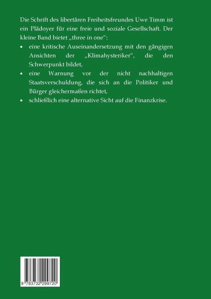 Die Schrift des libertären Freiheitsfreundes Uwe Timm ist ein Plädoyer für eine freie und soziale Gesellschaft. Der kleine Band bietet "three in one": eine kritische Auseinandersetzung mit den gängigen Ansichten der "Klimahysteriker", die den Schwerpunkt bildet, eine Warnung vor der nicht nachhaltigen Staatsverschuldung, die sich an die Politiker und Bürger gleichermaßen richtet, schließlich eine alternative Sicht auf die Finanzkrise.