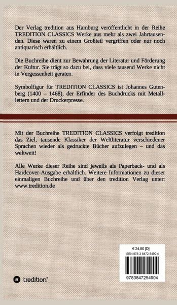 Diese Hardcover-Ausgabe ist Teil der TREDITION CLASSICS. Der Verlag tredition aus Hamburg veröffentlicht in der Buchreihe TREDITION CLASSICS Werke aus mehr als zwei Jahrtausenden. Diese waren zu einem Großteil vergriffen oder nur noch antiquarisch erhältlich. Mit TREDITION CLASSICS verfolgt tredition das Ziel, tausende Klassiker der Weltliteratur verschiedener Sprachen wieder als gedruckte Bücher zu verlegen und das weltweit! Die Buchreihe dient zur Bewahrung der Literatur und Förderung der Kultur. Sie trägt so dazu bei, dass viele tausend Werke nicht in Vergessenheit geraten.