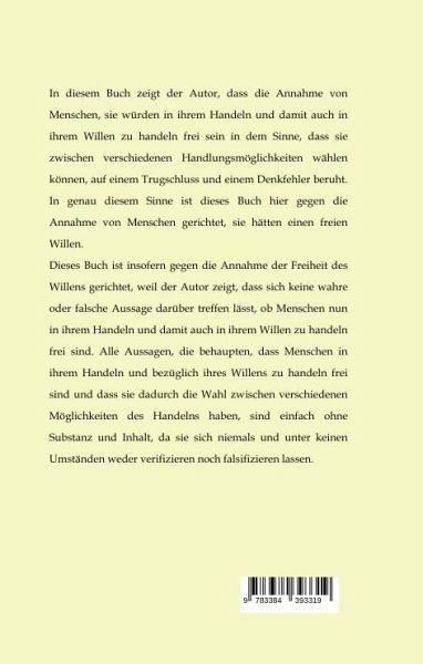 In diesem Buch zeige ich, dass die Annahme von Menschen, sie würden in ihrem Handeln und damit auch in ihrem Willen zu handeln frei sein in dem Sinne, dass sie zwischen verschiedenen Handlungsmöglichkeiten wählen können, auf einem Trugschluss und einem Denkfehler beruht. In genau diesem Sinne ist dieses Buch hier gegen die Annahme von Menschen gerichtet, sie hätten einen freien Willen. Das bedeutet aber nicht, dass ich in diesem Buch im Gegensatz dazu die Annahme vertrete, dass das menschliche Handeln determiniert ist und Menschen in ihrem Handeln und in ihrem Willen zu handeln nicht frei sind. Denn auch die Annahme von Menschen, sie wären in ihrem Handeln determiniert in dem Sinne, dass sie keine Wahl zwischen verschiedenen Handlungsmöglichkeiten haben, beruht ebenfalls auf einem Trugschluss und einem Denkfehler.Dieses Buch ist insofern gegen die Freiheit des Willens gerichtet, weil ich in ihm zeige, dass sich keine wahre oder falsche Aussage darüber treffen lässt, ob Menschen nun in ihrem Handeln und damit auch in ihrem Willen zu handeln frei sind. Alle Aussagen, die behaupten, dass Menschen in ihrem Handeln und bezüglich ihres Willens zu handeln frei sind und dass sie dadurch die Wahl zwischen verschiedenen Möglichkeiten des Handelns haben, sind einfach ohne Substanz und Inhalt, da sie sich niemals und unter keinen Umständen weder verifizieren noch falsifizieren lassen. Das werde ich anhand eines einfachen Gedankenexperiments zeigen.