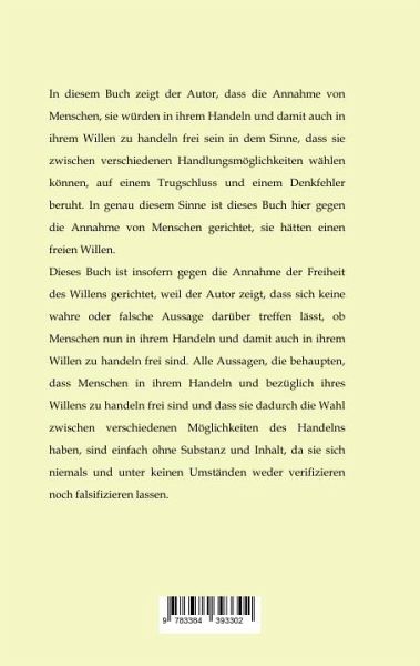 In diesem Buch zeige ich, dass die Annahme von Menschen, sie würden in ihrem Handeln und damit auch in ihrem Willen zu handeln frei sein in dem Sinne, dass sie zwischen verschiedenen Handlungsmöglichkeiten wählen können, auf einem Trugschluss und einem Denkfehler beruht. In genau diesem Sinne ist dieses Buch hier gegen die Annahme von Menschen gerichtet, sie hätten einen freien Willen. Das bedeutet aber nicht, dass ich in diesem Buch im Gegensatz dazu die Annahme vertrete, dass das menschliche Handeln determiniert ist und Menschen in ihrem Handeln und in ihrem Willen zu handeln nicht frei sind. Denn auch die Annahme von Menschen, sie wären in ihrem Handeln determiniert in dem Sinne, dass sie keine Wahl zwischen verschiedenen Handlungsmöglichkeiten haben, beruht ebenfalls auf einem Trugschluss und einem Denkfehler.Dieses Buch ist insofern gegen die Freiheit des Willens gerichtet, weil ich in ihm zeige, dass sich keine wahre oder falsche Aussage darüber treffen lässt, ob Menschen nun in ihrem Handeln und damit auch in ihrem Willen zu handeln frei sind. Alle Aussagen, die behaupten, dass Menschen in ihrem Handeln und bezüglich ihres Willens zu handeln frei sind und dass sie dadurch die Wahl zwischen verschiedenen Möglichkeiten des Handelns haben, sind einfach ohne Substanz und Inhalt, da sie sich niemals und unter keinen Umständen weder verifizieren noch falsifizieren lassen. Das werde ich anhand eines einfachen Gedankenexperiments zeigen.
