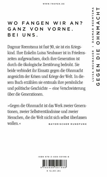 Luisa Neubauer hat eine besondere Beziehung zu ihrer Großmutter Dagmar Reemtsma. Seit sie ein Kind ist, besprechen sie alles miteinander. Persönliches, genauso wie die großen Fragen von Geschichte, Politik und Gesellschaft. Früh fingen sie an, darüber nachzudenken, was Privilegien bedeuten, und wie man ihnen gerecht wird. Sie wurden in sehr unterschiedliche und sehr schwierige Zeiten hineingeboren, mussten früh eine eigene Haltung finden: Dagmar Reemtsma wurde in Zeiten des erstarkenden Nationalsozialismus geboren, ihr Vater kam ineinem KZ ums Leben. Luisa Neubauer musste verstehen, dass das Land, in dem sie aufwächst, ihre Generation nicht vor der Klimakrise schützt. Als sie ihr Studium aufnimmt, um die ökologischen Katastrophen besser zu verstehen, stirbt ihr Vater. Doch der Ohnmacht zu erliegen, war für beide nie eine Option. Der Krieg gegen die Ukraine brach mitten in die Gespräche zu diesem Buch. Keine von beiden hätte geglaubt, je wieder Krieg in Europa erleben zu müssen. Und wieder stehen sie vor Haltungsfragen, vor Verantwortungsfragen und der Frage, was man der Ohnmacht entgegenstellt.
