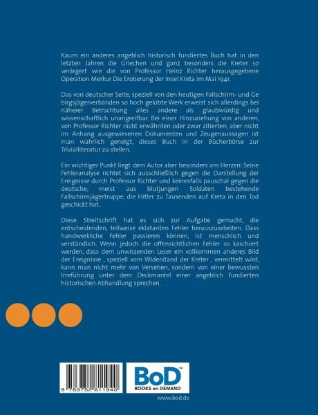 Kaum ein anderes angeblich historisch fundiertes Buch hat in den letzten Jahren die Griechen und ganz besonders die Kreter so verärgert wie die von Professor Heinz Richter herausgegebene Operation Merkur Die Eroberung der Insel Kreta im Mai 1941.Das von deutscher Seite, speziell von den heutigen Fallschirm- und Gebirgsjägerverbänden so hoch gelobte Werk erweist sich allerdings bei näherer Betrachtung alles andere als glaubwürdig und wissenschaftlich unangreifbar. Bei einer Hinzuziehung von anderen, von Professor Richter nicht erwähnten oder zwar zitierten, aber nicht im Anhang ausgewiesenen Dokumenten und Zeugenaussagen ist man wahrlich geneigt, dieses Buch in der Bücherbörse zur Trivialliteratur zu stellen.Ein wichtiger Punkt liegt dem Autor aber besonders am Herzen: Seine Fehleranalyse richtet sich ausschließlich gegen die Darstellung der Ereignisse durch Professor Richter und keinesfalls pauschal gegen die deutsche, meist aus blutjungen Soldaten bestehende Fallschirmjägertruppe, die Hitler zu Tausenden auf Kreta in den Tod geschickt hat.Diese Streitschrift hat es sich zur Aufgabe gemacht, die entscheidenden, teilweise eklatanten Fehler herauszuarbeiten. Dass handwerkliche Fehler passieren können, ist menschlich und verständlich. Wenn jedoch die offensichtlichen Fehler so kaschiert werden, dass dem unwissenden Leser ein vollkommen anderes Bild der Ereignisse , speziell vom Widerstand der Kreter , vermittelt wird, kann man nicht mehr von Versehen, sondern von einer bewussten Irreführung unter dem Deckmantel einer angeblich fundierten historischen Abhandlung sprechen.