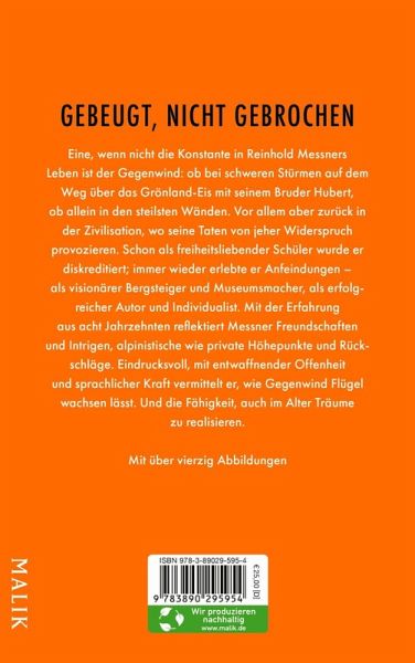 Eine, wenn nicht die Konstante in Reinhold Messners Leben ist der Gegenwind: ob als schwere Stürme auf dem Weg zum Südpol mit Arved Fuchs oder mit seinem Bruder Hubert über das Grönland-Eis, ob allein beim Zeltaufbau oder in den steilsten Wänden. Vor allem zurück in der Zivilisation, wo seine Taten von jeher Widerspruch provozieren. Schon als junger Bergsteiger wurde er diskreditiert; immer wieder erlebte er Anfeindungen - als meinungsstarker Individualist, Autor und Museumsmacher. Mit der Erfahrung aus acht Jahrzehnten reflektiert Messner Freundschaften und Intrigen, alpinistische wie private Höhepunkte und Rückschläge. Eindrucksvoll vermittelt er, wie Gegenwind Flügel wachsen lässt. Und die Fähigkeit, auch im Alter Träume zu realisieren.