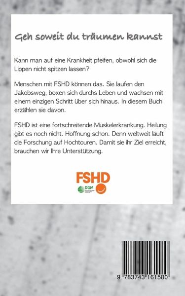 Kann man auf eine Krankheit pfeifen, obwohl sich die Lippen nicht spitzen lassen? Menschen mit FSHD können das. Sie laufen den Jakobsweg, boxen sich durchs Leben und wachsen mit einem einzigen Schritt über sich hinaus. In diesem Buch erzählen sie davon. FSHD ist eine fortschreitende Muskelerkrankung. Heilung gibt es noch nicht. Hoffnung schon. Denn durch das Engagement vieler betroffener Menschen ist es gelungen, das wissenschaftliche Interesse an FSHD zu wecken. Inzwischen läuft die Forschung weltweit auf Hochtouren.