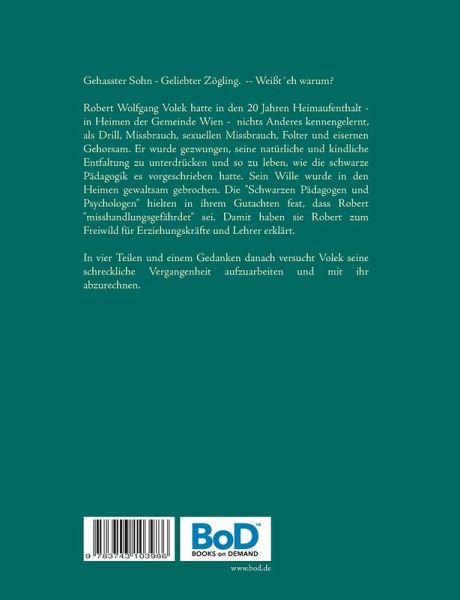 Gehasster Sohn - Geliebter Zögling Abrechnung mit der Mutter, die Robert immer gehasst hatte, ja noch immer hasst. Abrechnung mit dem System, der 20 jährigen Heimerziehung. Abrechnung mit der Zeit nach Heimentlassung und der Behördenwillkür.Robert hatte in den 20 Jahren Heimaufenthalt, in Heimen der Gemeinde Wien, nichts anderes kennengelernt, als Drill, Missbrauch, sexuellen Missbrauch, Folter und eisernen Gehorsam. Er wurde gezwungen, seine natürliche und kindliche Entfaltung zu unterdrücken und so zu leben, wie die schwarze Pädagogik es vorgeschrieben hat. Sein Wille wurde in den Heimen gewaltsam gebrochen. Die "Schwarzen Pädagogen und Psychologen" hielten in ihrem Gutachten fest, dass Robert "misshandlungsgefährdet" sei. Damit haben sie Robert zum Freiwild für Erziehungskräfte und Lehrer erklärt.In vier Teilen und einem Gedanken danach versucht Robert seine schreckliche Vergangenheit aufzuarbeiten und mit ihr abzurechnen.