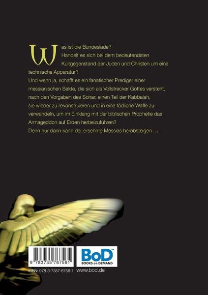 Was ist die Bundeslade?Handelt es sich bei dem bedeutendsten Kultgegenstand der Juden und Christen um eine technische Apparatur?Und wenn ja, schafft es ein fanatischer Prediger einer messianischen Sekte, die sich als Vollstrecker Gottes versteht, nach den Vorgaben des Sohar, einen Teil der Kabbalah, sie wieder zu rekonstruieren und in eine tödliche Waffe zu verwandeln, um im Einklang mit der biblischen Prophetie das Armageddon auf Erden herbeizuführen?Denn nur dann kann der ersehnte Messias herabsteigen ...