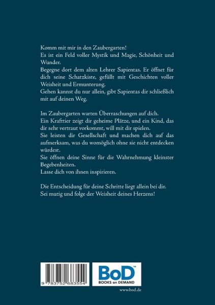 Komm mit mir in den Zaubergarten! Es ist ein Feld voller Mystik und Magie, Schönheit und Wunder. Begegne dort dem alten Lehrer Sapientas. Er öffnet für dich seine Schatzkiste, gefüllt mit Geschichten voller Weisheit, Liebe und Ermunterung. Gehen kannst du nur allein, gibt Sapientas dir schließlich mit auf deinen Weg. Im Zaubergarten warten Überraschungen auf dich. Ein Krafttier zeigt dir geheime Wege. Ein Kind, das dir sehr vertraut vorkommt, will mit dir spielen. Sie leisten dir Gesellschaft und machen dich auf das aufmerksam, was du womöglich ohne sie nicht entdecken würdest. Sie öffnen deine Sinne für die Wahrnehmung kleinster Begebenheiten. Lasse dich von ihnen inspirieren. Die Entscheidung für deine Schritte liegt allein bei dir. Sei mutig und folge der Weisheit deines Herzens!