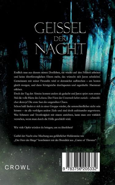 Endlich raus aus diesem tristen Dorfleben, nie wieder auf den Feldern arbeiten und keine überfürsorglichen Eltern mehr, das wünscht sich Jaron sehnlichst. Gemeinsam mit seiner Freundin wird er demnächst aufbrechen - am besten gleich morgen, und dann Königreiche durchqueren und sagenhafte Abenteuer erleben.Doch der Tag der Abreise kommt anders als gedacht und Jaron spürt zum ersten Mal die volle Härte des Lebens. Der Fürst der Unterwelt kehrt zurück - schrecklicher denn je! Die erste Saat des ungeteilten Chaos.Schon bald findet er sich in einer Gruppe wieder, die unterschiedlicher nicht sein könnte - sie alle verfolgen andere Ziele und sind doch aufeinander angewiesen. Was Schmerz und Trostlosigkeit mit einem anrichten, kann man erst wirklich verstehen, wenn man durch die Hölle geschleift wird.Wie viele Opfer würdest du bringen, um zu überleben?Geißel der Nacht eine Mischung aus gefährlicher Heldenreise wie "Der Herr der Ringe" kombiniert mit der Brutalität aus "Game of Thrones".