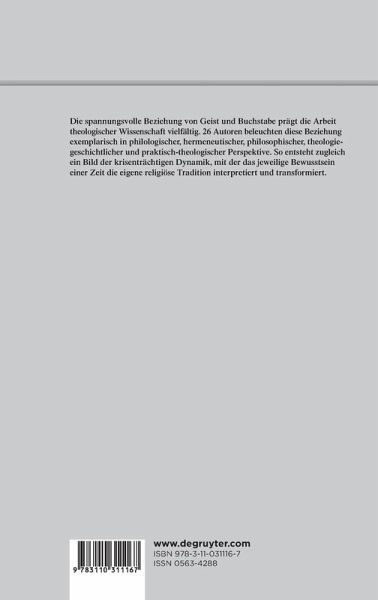 The fascinating connection between the spirit and the letter has had a deep impact on the work of theological scholarship. In this volume, 26 experts examine the connection of spirit and letter by means of examples from the perspectives of philology, hermeneutics, philosophy, theological history, and practical theology. From this multi-disciplinary view, a picture emerges of a dynamic fraught with crisis, with which the specific consciousness of each era interpreted and transformed a unique religious tradition.