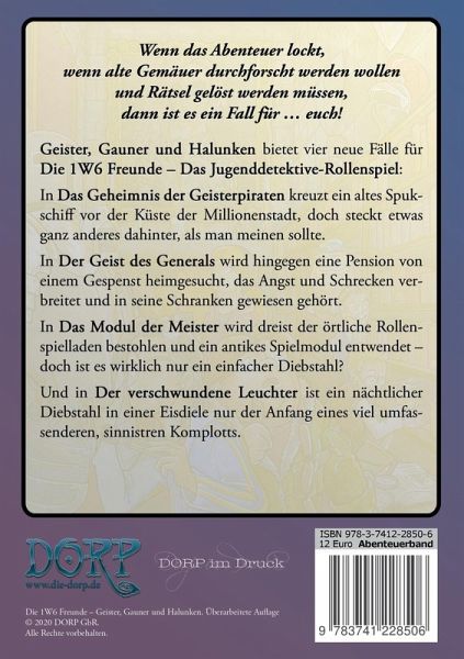 Wenn das Abenteuer lockt, wenn alte Gemäuer durchforscht werden wollen und Rätsel gelöst werden müssen, dann ist es ein Fall für ... euch!Geister, Gauner und Halunken bietet vier neue Fälle für Die 1W6 Freunde - Das Jugenddetektive-Rollenspiel:In Das Geheimnis der Geisterpiraten kreuzt ein altes Spukschiff vor der Küste der Millionenstadt, doch steckt etwas ganz anderes dahinter, als man meinen sollte.In Der Geist des Generals wird hingegen eine Pension von einem Gespenst heimgesucht, das Angst und Schrecken verbreitet und in seine Schranken gewiesen gehört.In Das Modul der Meister wird dreist der örtliche Rollenspielladen bestohlen und ein antikes Spielmodul entwendet - doch ist es wirklich nur ein einfacher Diebstahl?Und in Der verschwundene Leuchter ist ein nächtlicher Diebstahl in einer Eisdiele nur der Anfang eines viel umfassenderen, sinistren Komplotts.