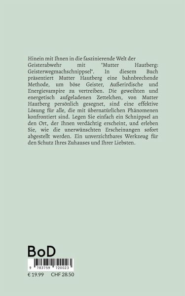 Hinein mit Ihnen in die faszinierende Welt der Geisterabwehr mit "Mutter Hautberg: Geisterwegmachschnippsel". In diesem Buch präsentiert Mutter Hautberg eine bahnbrechende Methode, um böse Geister, Außerirdische und Energievampire zu vertreiben. Die geweihten und energetisch aufgeladenen Zettelchen, von Mutter Hautberg persönlich gesegnet, sind eine effektive Lösung für alle, die mit übernatürlichen Phänomenen konfrontiert sind. Legen Sie einfach ein Schnippsel an den Ort, der Ihnen verdächtig erscheint, und erleben Sie, wie die unerwünschten Erscheinungen sofort abgestellt werden. Ein unverzichtbares Werkzeug für den Schutz Ihres Zuhauses und Ihrer Liebsten.