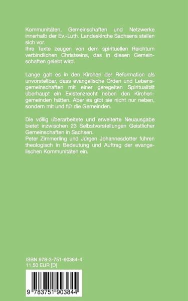 Kommunitäten, Gemeinschaften und Netzwerke innerhalb der Ev.-Luth. Landeskirche Sachsens stellen sich vor. Ihre Texte zeugen von dem spirituellen Reichtum verbindlichen evangelischen Christseins, das in diesen Gemeinschaften gelebt wird. Lange galt es in den Kirchen der Reformation als unvorstellbar, dass evangelische Orden und Lebensgemeinschaften mit einer geregelten Spiritualität überhaupt ein Existenzrecht neben den Kirchengemeinden hätten. Aber es gibt sie nicht nur neben, sondern mit und für die Gemeinden. Die Neuausgabe versammelt in erweiterter und überarbeiteter Fassung nunmehr 23 Selbstvorstellungen von Geistlichen Gemeinschaften in Sachsen. Beiträge von Peter Zimmerling und Jürgen Johannesdotter führen theologisch in Auftrag und Bedeutung evangelischer Kommunitäten ein. Mit Geleitworten von Oberlandeskirchenrat Thilo Daniel und Landesbischof Christoph Meyns.