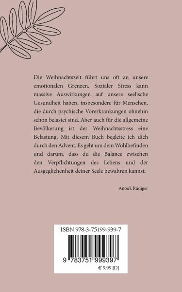Die Weihnachtszeit führt uns oft an unsere emotionalen Grenzen. Sozialer Stress kann massive Auswirkungen auf unsere seelische Gesundheit haben, insbesondere für Menschen, die durch psychische Erkrankungen ohnehin schon vorbelastet sind.Aber auch für die allgemeine Bevölkerung ist der Weihnachtsstress eine Belastung. Mit diesem Buch begleite ich dich durch diese Zeit und es geht hier um dich. Um dein Wohlbefinden und darum, dass du die Balance bewahren kannst, zwischen Verpflichtungen des Lebens und der Ausgeglichenheit der Seele.Erlebe deine ganz persönliche stärkende Adventszeit.