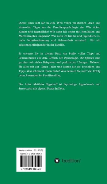 Das Buch bietet, neben umfangreichen Erziehungstipps aus der Psychologie, die Möglichkeit das eigenes Verhalten zu reflektieren, damit auch Sie gelassener durch den Alltag gehen. In welchen Rollen lebe ich? Bekomme und gebe ich die Zuwendung, die ich benötige? Wie löse ich konstruktiv meine Probleme in der Familie?