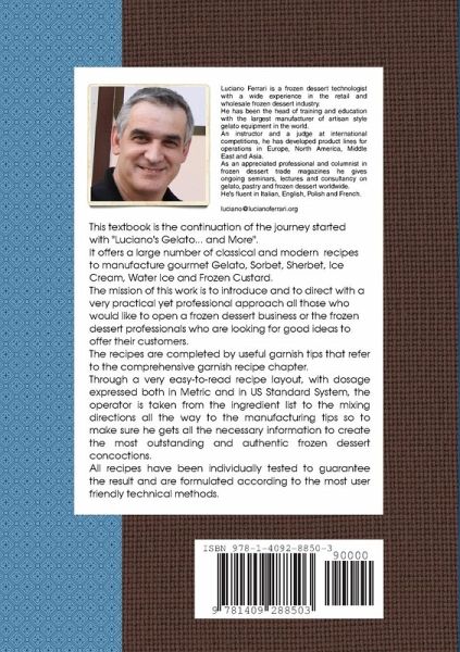 This textbook offers a large number of classical and modern recipes to manufacture gourmet Gelato, Sorbet, Sherbet, Ice Cream, Water Ice and Frozen Custard. The mission of this work is to introduce and to direct with a very practical yet professional approach all those who would like to open a frozen dessert business or the frozen dessert professionals who are looking for good ideas to offer their customers. The recipes are completed by useful garnish tips that refer to the comprehensive garnish recipe chapter. Through a very easy-to-read recipe layout, with dosage expressed both in metric and in US Standard System, the operator is taken from the ingredient list to the mixing directions all the way to the manufacturing tips so to make sure he gets all the necessary information to create the most outstanding and authentic frozen dessert concoctions. All recipes have been individually tested to guarantee the result and are formulated according to the most user's friendly technical methods.