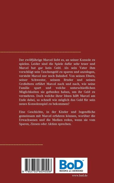 Der zwölfjährige Marcel liebt es, an seiner Konsole zu spielen. Leider sind die Spiele dafür sehr teuer und Marcel hat gar kein Geld. Als sein Vater ihm vorschlägt, sein Taschengeld zu sparen und anzulegen, versteht Marcel nur noch Bahnhof. Von seinen Eltern, seiner Schwester, seinem Bruder und seinen Großeltern erfährt Marcel nach und nach, wie seine Familie spart und welche unterschiedlichen Möglichkeiten sie gefunden haben, um ihr Geld zu vermehren. Doch welche ihrer Ideen hilft Marcel am Ende dabei, so schnell wie möglich das Geld für sein neues Konsolenspiel zu bekommen?Eine Geschichte, in der Kinder und Jugendliche gemeinsam mit Marcel erfahren können, worüber die Erwachsenen und die Medien reden, wenn sie vom Sparen, Zinsen oder Aktien sprechen.