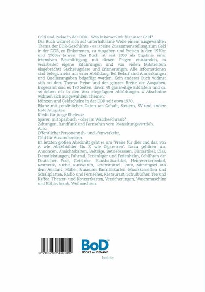 Geld und Preise in der DDRWas bekamen wir für unser Geld?Eine Zusammenstellung zum Geld, zu Einkommen, Ausgaben und Preisen in den 1970er und 1980er JahrenDas Buch widmet sich auf unterhaltsame Weise einem ausgewählten Thema der DDR-Geschichte - es ist eine Zusammenstellung zum Geld in der DDR, zu Einkommen, zu Ausgaben und Preisen. Das Buch ist seit 2008 als Ergebnis einer intensiven Beschäftigung mit diesen Fragen entstanden, es verarbeitet eigene Erfahrungen und von vielen Mitstreitern eingebrachte Sachzeugnisse und Erinnerungen. Alle Informationen sind belegt, ¬meist mit einer Abbildung. Bei Bedarf sind Anmerkungen und Quellenangaben beigefügt worden. Kein anderes Buch widmet sich so dem Thema Preise und der ganzen Breite der Ausgaben. Insgesamt sind es 130 Seiten, davon 49 ganzseitige Bildtafeln und ca. 46 Seiten mit in den Text eingefügten Abbildungen. In 8 Abschnitten geht es um Münzen und Geldscheine in der DDR in den 70er Jahren Bilanz mit persönlichen Daten um Gehalt, Steuern, Sozialversicherung und andere feste Ausgaben Kredit für junge EheleuteSparen mit Sparbuch - oder im Wäscheschrank?Zeitungen, Zeitschriften, Rundfunk und Fernsehen - vom PostzeitungsvertriebAutoÖffentlicher Personennah- und -fernverkehrGeld für AuslandsreisenIm letzten großen Abschnitt geht es um "Preise für dies und das, von A wie Abziehbilder bis Z wie Zigaretten". Dazu gehören u.a. Annoncen, Ansichtskarten, Beiträge, Betriebsessen, Büroartikel, Dias, Dienstleistungen, Fahrrad, Ferienlager und Ferienheim, Gebühren der Deutschen Post, Getränke, Haushaltsartikel, Heimwerkerbedarf, Kosmetik, Küche, Kurzwaren, Lebensmittel, Lotto, Mitbringsel aus dem Ausland, Möbel, Museums-Eintrittskarten, Musikkassetten und Schallplatten, Radio und Fernseher, Restaurant, Schulbücher, Tee und Kaffee, Theater- und Konzertkarten, Versicherungen, Waschmaschine und Kühlschrank, Weihnachten.