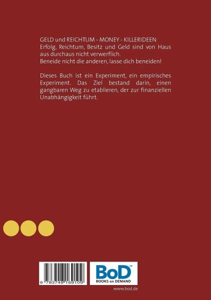 GELD und REICHTUM - MONEY - KILLERIDEENErfolg, Reichtum, Besitz und Geld sind von Haus aus durchaus nicht verwerflich.Beneide nicht die anderen, lasse dich beneiden!Dieses Buch ist ein Experiment, ein empirisches Experiment. Das Ziel bestand darin, einen gangbaren Weg zu etablieren, der zur finanziellen Unabhängigkeit führt.