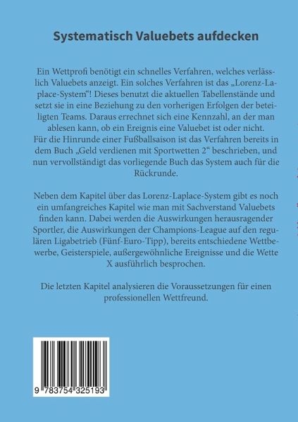 In dem Vorgängerbuch "Geld verdienen mit Sportwetten 2" wurde ein Verfahren zur Auffindung von Valuebets für die Hinrunde einer Fußball- oder Basketballsaison vorgestellt.Dieses Buch vervollständigt und modifiziert diese Idee auch für die Rückrunde einer Saison.Zusätzlich gibt es ein umfangreiches Kapitel für die Auffindung von Valuebets mit Sachverstand, welches vollkommen unabhängig von dem Lorenz-Laplace-System anwendbar ist.