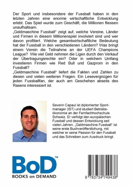 Der Sport und insbesondere der Fussball haben in den letzten Jahren eine enorme wirtschaftliche Entwicklung erlebt. Das Spiel wurde zum Geschäft, die Millionen fliessen unaufhaltsam."Geldmaschine Fussball" zeigt auf, welche Vereine, Länder und Firmen in diesem Millionenspiel involviert sind und wer davon profitiert. Welche gesamtwirtschaftliche Bedeutung hat der Fussball in den verschiedenen Ländern? Was bringt einem Verein die Teilnahme an der UEFA Champions League? Wie viel Geld nehmen die Ligen durch den Verkauf der Übertragungsrechte ein? Oder in welchem Umfang investieren Firmen wie Red Bull und Gazprom in den Fussball?"Geldmaschine Fussball" liefert die Fakten und Zahlen zu diesen und vielen weiteren Fragen. Ein Lesevergnügen für jeden Fussballfan, der auch am Geschehen abseits des Rasens interessiert ist.