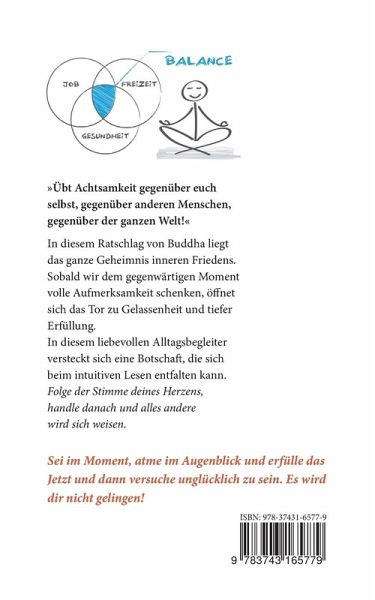 Übt Achtsamkeit gegenüber euch selbst, gegenüber anderen Menschen, gegenüber der ganzen Welt!In diesem Ratschlag des Buddha liegt das ganze Geheimnis inneren Friedens. Sobald wir dem gegenwärtigen Moment volle Aufmerksamkeit schenken, öffnet sich das Tor zu Gelassenheit und tiefer Erfüllung. In diesem liebevollen Alltagsbegleiter versteckt sich eine Botschaft, die sich beim intuitiven Lesen entfalten wird. Folge der Stimme Deines Herzens, handle danach und alles andere wird sich weisen. Sei im Moment, atme im Augenblick und erfülle das Jetzt und dann versuche unglücklich zu sein. Es wird Dir nicht gelingen!