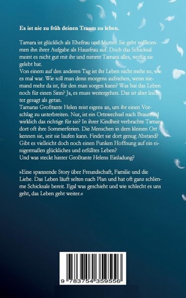 Es ist nie zu früh deinen Traum zu leben.Tamara ist glücklich als Ehefrau und Mutter. Sie geht vollkommen ihn ihrer Aufgabe als Hausfrau auf. Doch das Schicksal meint es nicht gut mit ihr und nimmt Tamara alles, wofür sie gelebt hat.Von einem auf den anderen Tag ist ihr Leben nicht mehr so, wie es mal war. Wie soll man denn morgens aufstehen, wenn niemand mehr da ist, für den man sorgen kann? Was hat das Leben noch für einen Sinn? Ja, es muss weitergehen. Das ist aber leichter gesagt als getan.Tamaras Großtante Helen reist eigens an, um ihr einen Vorschlag zu unterbreiten. Nur, ist ein Ortswechsel nach Braunried wirklich das richtige für sie? In ihrer Kindheit verbrachte Tamara dort oft ihre Sommerferien. Die Menschen in dem kleinen Ort kennen sie, seit sie laufen kann. Findet sie dort genug Abstand?Gibt es vielleicht doch noch einen Funken Hoffnung auf ein einigermaßen glückliches und erfülltes Leben?Und was steckt hinter Großtante Helens Einladung?»Eine spannende Story über Freundschaft, Familie und die Liebe. Das Leben läuft selten nach Plan und hat oft ganz schlimme Schicksale bereit. Egal was geschieht und wie schlecht es uns geht, das Leben geht weiter.«