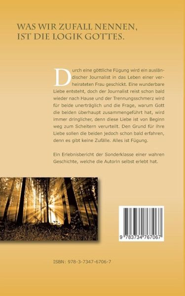 Durch eine göttliche Fügung wird ein ausländischer Journalist in das Leben einer verheirateten Frau geschickt. Eine wunderbare Liebe entsteht, doch der Journalist reist schon bald wieder nach Hause und der Trennungsschmerz wird für beide unerträglich. Die Frage, warum Gott die beiden überhaupt zusammengeführt hat, wird immer dringlicher, denn diese Liebe ist von Beginn weg zum Scheitern verurteilt. Den Grund für ihre Liebe sollen beide jedoch schon bald erfahren, denn es gibt keine Zufälle. Alles ist Fügung. Dies ist die wunderbare, wahre Geschichte einer grossen Liebe, die von Gott geplant, geführt und nach erfolgreicher Mission auch wieder beendet wird. Ein Erlebnisbericht der Sonderklasse einer wahren Geschichte, welche die Autorin selbst erlebt hat.