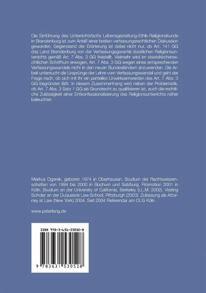Die Einführung des Unterrichtsfachs Lebensgestaltung-Ethik-Religionskunde in Brandenburg ist zum Anlaß einer breiten verfassungsrechtlichen Diskussion geworden. Gegenstand der Erörterung ist dabei nicht nur, ob Art. 141 GG das Land Brandenburg von der Verfassungsgarantie staatlichen Religionsunterrichts gemäß Art. 7 Abs. 3 GG freistellt. Vielmehr wird im staatskirchenrechtlichen Schrifttum erwogen, Art. 7 Abs. 3 GG wegen eines entsprechenden Verfassungswandels nicht in den neuen Bundesländern anzuwenden. Die Arbeit untersucht die Ursprünge der Lehre vom Verfassungswandel und geht der Frage nach, ob sich mit ihr ein partielles Unwirksamwerden des Art. 7 Abs. 3 GG begründen läßt. In diesem Zusammenhang wird neben der Problematik, ob Art. 7 Abs. 3 Satz 1 GG als Grundrecht zu qualifizieren ist, auch die rechtliche Zulässigkeit einer Entkonfessionalisierung des Religionsunterrichts näher beleuchtet.