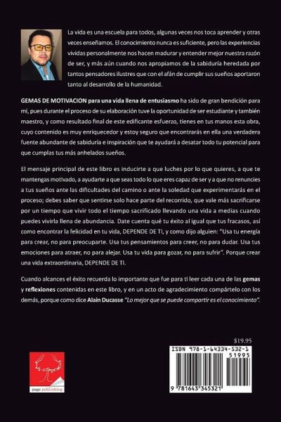 La vida es una escuela para todos, algunas veces nos toca aprender y otras veces ensenamos. El conocimiento nunca es suficiente, pero las experiencias vividas personalmente nos hacen madurar y entender mejor nuestra razon de ser, y mas aun cuando nos apropiamos de la sabiduria heredada por tantos pensadores ilustres que con el afan de cumplir sus suenos aportaron tanto al desarrollo de la humanidad. GEMAS DE MOTIVACION para una vida llena de entusiasmo ha sido de gran bendicion para mi, pues durante el proceso de su elaboracion tuve la oportunidad de ser estudiante y tambien maestro, y como resultado final de este edificante esfuerzo, tienes en tus manos esta obra, cuyo contenido es muy enriquecedor y estoy seguro que encontraras en ella una verdadera fuente abundante de sabiduria e inspiracion que te ayudara a desatar todo tu potencial para que cumplas tus mas anhelados suenos. El mensaje principal de este libro es inducirte a que luches por lo que quieres, a que te mantengas motivado, a ayudarte a que seas todo lo que eres capaz de ser y a que no renuncies a tus suenos ante las dificultades del camino o ante la soledad que experimentaras en el proceso; debes saber que sentirse solo hace parte del recorrido, que vale mas sacrificarse por un tiempo que vivir todo el tiempo sacrificado llevando una vida a medias cuando puedes vivirla llena de abundancia. Date cuenta que tu exito al igual que tus fracasos, asi como encontrar la felicidad en tu vida, DEPENDE DE TI, y como dijo alguien: "Usa tu energia para crear, no para preocuparte. Usa tus pensamientos para creer, no para dudar. Usa tus emociones para atraer, no para alejar. Usa tu vida para gozar, no para sufrir". Porque crear una vida extraordinaria, DEPENDE DE TI. Cuando alcances el exito recuerda lo importante que fue para ti leer cada una de las gemas y reflexiones contenidas en este libro, y en un acto de agradecimiento compartelo con los demas, porque como dice Alain Ducasse "Lo mejor que se puede compartir es el conocimiento".
