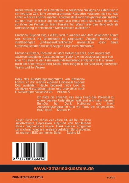 Selten waren Hunde als Unterstützer in seelischen Notlagen so aktuell wie in der heutigen Zeit. Eine weltumspannende Pandemie verändert nicht nur das Leben wie wir es bisher kannten, sondern stellt auch das ganze (Berufs)-leben auf den Kopf. In dieser Zeit erinnern sich immer mehr Menschen daran, wie gut ihnen der Kontakt zu ihrem Haustier tut. Warum also den Hund nicht als Unterstützung in emotionalen Notsituationen ausbilden? Emotional Support Dogs (ESD) sind in Amerika und dem asiatischen Raum weit verbreitet. Als Unterstützer bei Depression, Ängsten, BurnOut und streßbedingten Zivilisationskrankheiten unterstützen schon heute hunderttausende Emotional Support Dogs ihren Menschen.Katharina Küsters, Pionierin auf dem Gebiet der ESD, erste anerkannte Sachverständige für Assistenzhunde (BDSF e.V.) in Deutschland und seit über 10 Jahren in der Assistenzhundeausbildung erfolgreich, teilt in diesem Buch die Erkenntnisse Ihrer Studie, Erfahrungen in der Ausbildung dutzender Teams undihr Wissen.