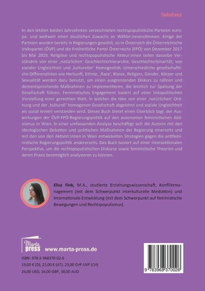 In den letzten beiden Jahrzehnten verzeichneten rechtspopulistische Parteien europa- und weltweit einen deutlichen Zuwachs an Wähler:innenstimmen. Einige der Parteien wurden bereits in Regierungen gewählt, so in Österreich die Österreichische Volkspartei (ÖVP) und die Freiheitliche Partei Österreichs (FPÖ) von Dezember 2017 bis Mai 2019. Religiöse und rechtspopulistische Akteur:innen teilen dasselbe Verständnis von einer 'natürlichen' Geschlechterhierarchie, Geschlechterbinarität, von sozialer Ungleichheit und 'kultureller' Homogenität. Unterschiedliche gesellschaftliche Differenzlinien wie Herkunft, Ethnie, 'Race', Klasse, Religion, Gender, Körper und Sexualität werden dazu benutzt, um einen ausgrenzenden Diskurs zu nähren und dementsprechende Maßnahmen zu implementieren, die letztlich zur Spaltung der Gesellschaft führen. Feministisches Engagement basiert auf einer linkspolitischen Vorstellung einer gerechten Welt, in welcher die Idee von einer 'natürlichen' Ordnung und der 'kulturell' homogenen Gesellschaft abgelehnt und soziale Ungleichheit als sozial kreiert verstanden wird. Dieses Buch bietet einen Überblick bzgl. der Auswirkungen der ÖVP-FPÖ-Regierungspolitik auf den autonomen feministischen Aktivismus in Wien. In einer umfassenden Analyse beschäftigt sich die Autorin mit den ideologischen Debatten und politischen Maßnahmen der Regierung einerseits und mit den von den Aktivist:innen in Wien entwickelten Strategien gegen die antifeministische Regierungspolitik andererseits. Das Buch basiert auf einer intersektionalen Perspektive, um die rechtspopulistischen Diskurse sowie feministische Theorien und deren Praxis bestmöglich analysieren zu können.