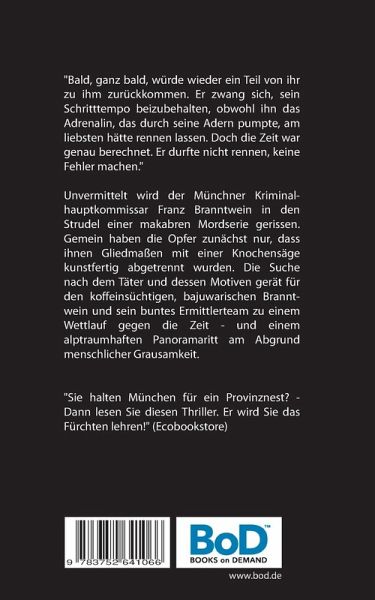 "Bald, ganz bald, würde wieder ein Teil von ihr zu ihm zurückkommen. Er zwang sich, sein Schritttempo beizubehalten, obwohl ihn das Adrenalin, das durch seine Adern pumpte, am liebsten hätte rennen lassen. Doch die Zeit war genau berechnet. Er durfte nicht rennen, keine Fehler machen." Unvermittelt wird der Münchner Kriminalhauptkommissar Franz Branntwein in den Strudel einer makabren Mordserie gerissen. Gemein haben die Opfer zunächst nur, dass ihnen Gliedmaßen mit einer Knochensäge kunstfertig abgetrennt wurden. Die Suche nach dem Täter und dessen Motiven gerät für den koffeinsüchtigen, bajuwarischen Branntwein und sein buntes Ermittlerteam zu einem Wettlauf gegen die Zeit - und einem alptraumhaften Panoramaritt am Abgrund menschlicher Grausamkeit."Sie halten München für ein Provinznest? - Dann lesen Sie diesen Thriller. Er wird Sie das Fürchten lehren!" (Ecobookstore)