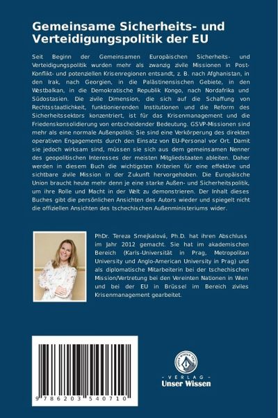 Seit Beginn der Gemeinsamen Europäischen Sicherheits- und Verteidigungspolitik wurden mehr als zwanzig zivile Missionen in Post-Konflikt- und potenziellen Krisenregionen entsandt, z. B. nach Afghanistan, in den Irak, nach Georgien, in die Palästinensischen Gebiete, in den Westbalkan, in die Demokratische Republik Kongo, nach Nordafrika und Südostasien. Die zivile Dimension, die sich auf die Schaffung von Rechtsstaatlichkeit, funktionierenden Institutionen und die Reform des Sicherheitssektors konzentriert, ist für das Krisenmanagement und die Friedenskonsolidierung von entscheidender Bedeutung. GSVP-Missionen sind mehr als eine normale Außenpolitik: Sie sind eine Verkörperung des direkten operativen Engagements durch den Einsatz von EU-Personal vor Ort. Damit sie jedoch wirksam sind, müssen sie sich aus dem gemeinsamen Nenner des geopolitischen Interesses der meisten Mitgliedstaaten ableiten. Daher werden in diesem Buch die wichtigsten Kriterien für eine effektive und sichtbare zivile Mission in der Zukunft hervorgehoben. Die Europäische Union braucht heute mehr denn je eine starke Außen- und Sicherheitspolitik, um ihre Rolle und Macht in der Welt zu demonstrieren. Der Inhalt dieses Buches gibt die persönlichen Ansichten des Autors wieder und spiegelt nicht die offiziellen Ansichten des tschechischen Außenministeriums wider.