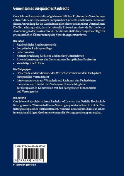 Cora Schmuhl analysiert die möglichen rechtlichen Probleme des Verordnungsentwurfs für ein Gemeinsames Europäisches Kaufrecht und bewertet detailliert dessen Anwendung für die Geschäftstätigkeit kleiner und mittlerer Unternehmen. Die Betrachtung zeigt, dass der aktuelle Entwurf gravierende Nachteile zur Anwendung in der Praxis aufweist. Die Autorin stellt Änderungsvorschläge zur grundsätzlichen Überarbeitung des Verordnungsentwurfs vor.