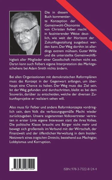 Dieses Buch befasst sich vorwiegend mit der Gemeinwohl-Ökonomie des gleichnamigen Buches von Christian Felber.Seine Visionen sind faszinierend, aber erst erreichbar, wenn sie einerseits auf einem solideren theoretischen Fundament abgesichert werden und andererseits sich als erstes mit der Erneuerung der heutigen politischen und gesellschaftlichen Situation befassen.Wer sich realisiert, in welchem Ausmaße wir Bürger von den meisten uns umgebenden politischen, ökonomischen und gesellschaftlichen Organisationen und Institutionen ausgenutzt und abgezockt werden, verliert die Hoffnung, dass die Bürger sich jemals aus ihrer politischen Bedeutungslosigkeit befreien könnten.Erst wenn es gelingt, die folgenschwere Triade Machtgier, Habgier und Korruption zu zerschlagen, kann ein neuer Weg in die Zukunft führen. Der Weg ist das Ziel.Wer generell an der Gemeinwohl-Problematik interessiert ist, kann kostenlos eine Kompaktversion meines Buches 'Gemeinwohl in schwerer See' downloaden unter derISBN 9783744833134.