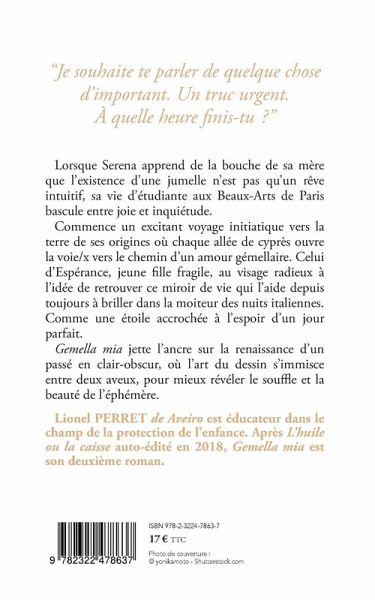 Lorsque Serena apprend de la bouche de sa mère que l'existence d'une jumelle n'est pas qu'un rêve intuitif, sa vie d'étudiante aux Beaux-Arts de Paris bascule entre joie et inquiétude. Commence un excitant voyage initiatique vers la terre de ses origines où chaque allée de cyprès ouvre la voie/x vers le chemin d'un amour gémellaire. Celui d'Espérance, jeune fille fragile, au visage radieux à l'idée de retrouver ce miroir de vie qui l'aide depuis toujours à briller dans la moiteur des nuits italiennes. Comme une étoile accrochée à l'espoir d'un jour parfait. Gemella mia jette l'ancre sur la renaissance d'un passé en clair-obscur, où l'art du dessin s'immisce entre deux aveux, pour mieux révéler le souffle et la beauté de l'éphémère.