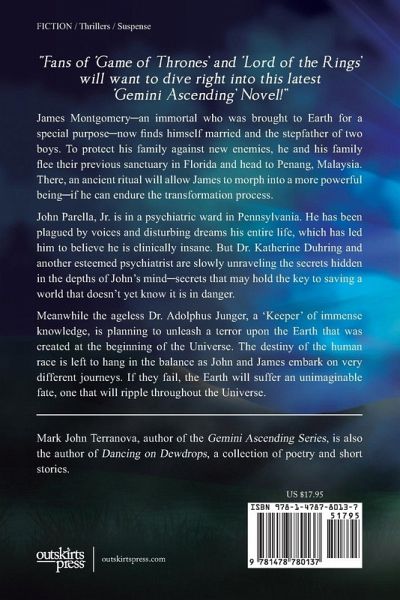 Gemini Ascending: Tempting Eternity, the latest in the Gemini Ascending series of novels, is meant for those who believe the world we live in, the lives that we lead, and the wonders that we see in the universe all have purpose. The unfolding events on Earth over time has created serious consequences for its people, steering them towards an unimaginable fate, one that very few are aware of. However, an immortal, driven to evolve, and a psychiatric patient, whose doctors strive to unravel the secrets hidden in the depths of his mind, could give the Earth a chance, unless they fail in their initial quests. The incredible ending in this latest novel, the women who emerge to take on leadership roles while struggling with their personal relationships, and the breadth of storyline creates a tale, in modern times, similar to that in the "Game of Thrones," and "Lord of the Rings." "…Terranova's concise prose generates memorable scenes." - Kirkus Reviews "The story triumphantly fuses fantasy with real-world relationships…." - Kirkus Reviews "A captivating otherworldly sequel that should appeal to both new and returning readers." - Kirkus Reviews