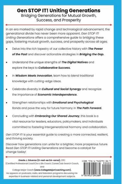 In Gen STOP IT! Uniting Generations: Bridging Generations for Mutual Growth, Success, and Prosperity, DAversa presents a powerful guide to leveraging generational strengths for societal harmony. This insightful book explores historical wisdom, mutual respect, and the synergy between tradition and innovation. Through practical strategies, highlights the transformative role of technology, intergenerational teamwork, and cultural diversity. Essential for leaders, educators, and individuals, this book offers a comprehensive roadmap to a prosperous future, emphasizing collaboration, empathy, and economic stability across generations.