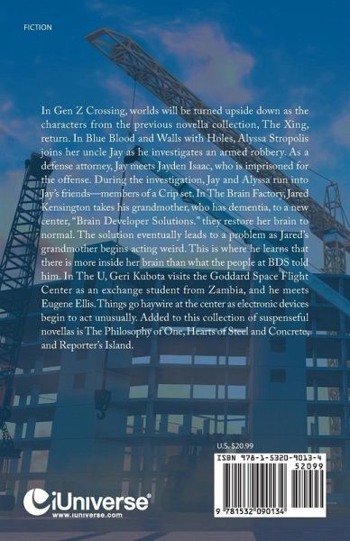 In Gen Z Crossing, worlds will be turned upside down as the characters from the previous novella collection, The Xing, return. In Blue Blood and Walls with Holes, Alyssa Stropolis joins her uncle Jay as he investigates an armed robbery. As a defense attorney, Jay meets Jayden Isaac, who is imprisoned for the offense. During the investigation, Jay and Alyssa run into Jay's friends-members of a Crip set. In The Brain Factory, Jared Kensington takes his grandmother, who has dementia, to a new center, "Brain Developer Solutions." they restore her brain to normal. The solution eventually leads to a problem as Jared's grandmother begins acting weird. This is where he learns that there is more inside her brain than what the people at BDS told him. In The U, Geri Kubota visits the Goddard Space Flight Center as an exchange student from Zambia, and he meets Eugene Ellis. Things go haywire at the center as electronic devices begin to act unusually. Added to this collection of suspenseful novellas is The Philosophy of One, Hearts of Steel and Concrete, and Reporter's Island.