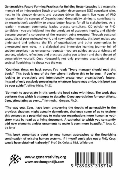 Genarrativity, Future Forming Practices for Building Better Legacies is a magnetic memoir of an independent Dutch organization development (OD) consultant who, next to his already dynamic and purpose driven life, spent five years of PhD research into the concept of Organizational Generativity, aiming to contribute to an organization's capability to create better futures for all its stakeholders. As a reader - manager, community leader, process consultant, OD scholar or PhD candidate - you are initiated into the unruly art of academic inquiry, and slightly become yourself a co-creator of the research being executed. Through personal cases, bits of peer-reviewed work, and new (un)frameworks, this book makes you understand and enhance the life of organizations and other communities in unexpected new ways. In a dialogical and immersive learning journey full of sudden surprises - as emergence requests - you are guided across a richness of sources, wisdom, reflections and practices urging you to learn and share the art of genarrativity yourself. Cees Hoogendijk not only promotes organizational and societal flourishing; he shows you the way. A word from the author What we call 'crisis', would that actually be 'complexity' without knowing yet how to deal with it properly? Wrapped in a memoir, and mixed with peer reviewed findings, Genarrative presents an in-depth understanding of how conscious use of the word 'generative/-ity' can contribute to organizational and societal betterness. My research journey into the generative qualities of organizations and communities covers a lifespan of personal and professional experiences of which I share the highlights in Genarrative. I hope you will be inspired by my three frameworks - as practical as they can be - connecting generativity to language, processes and social entities. Moreover, you may enjoy engaging in the ongoing process of future forming inquiry yourself, for which Genarrative provides tools and guidance. The ones who take the effort in practicing the practices, will be acknowled- ged as being 'genarrative' and appreciated for being good ancestors: for having created new promising stories, that fueled next generations to build the world they love. In essence, generativity is the quality to give life and to create healthy futures. It is my sincere hope that this book generates like-minded, actionable 'genarrators'. Would you be one? Cees Hoogendijk Start and end of the Preflection by professor Ron Fry "My first journey through this work by Cees was a wonderful ride. It was full of inner 'yes,' 'aha,' 'never looked at it that way,' and outer smiles, with some thoughtful frowns. Overall it is a tour-de-force into a deeper view of generativity, generative connections, and the novel idea of the "genarrator" to help those interested in nurturing, transforming, changing or developing human systems toward being spaces for everyone to flourish within." [...] "I look forward to the next time and space to wander through this book again. Like every time I view my garden, there are likely to be experiences of newness and sameness, but always an inviting and fertile space for discovery and growth."