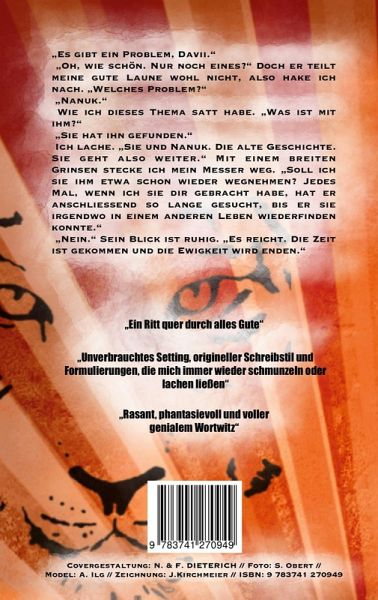 >Es gibt ein Problem, Davii.< >Oh, wie schön. Nur noch eines?< Doch er teilt meine gute Laune wohl nicht, also hake ich nach. >Welches Problem?< >Nanuk.< Wie ich dieses Thema satt habe. >Was ist mit ihm?< >Sie hat ihn gefunden.< Ich lache. >Sie und Nanuk. Die alte Geschichte. Sie geht also weiter.< Mit einem breiten Grinsen stecke ich mein Messer weg. >Soll ich sie ihm etwa schon wieder wegnehmen? Jedes Mal, wenn ich sie dir gebracht habe, hat er anschließend so lange gesucht, bis er sie irgendwo in einem anderen Leben wiederfinden konnte.< >Nein.< Sein Blick ist ruhig. >Es reicht. Die Zeit ist gekommen und die Ewigkeit wird enden.<2016 Erstauflage2024 Neuauflage (unveränderter Text & überarbeitetes Buchcover)