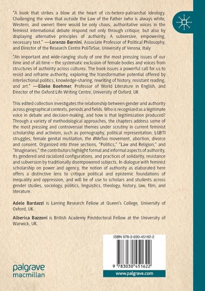 Who is recognized as a legitimate voice in debate and decision-making, and how is that legitimization produced? Through a variety of methodological approaches, the chapters address some of the most pressing and controversial themes under scrutiny in current feminist scholarship and activism, such as pornography, political representation, LGBTI struggles, female genital mutilation, the #MeToo movement, abortion, divorce and consent. Organized into three sections, "Politics," "Law and Religion," and "Imaginaries," the contributors highlight formal and informal aspects of authority, its gendered and racialized configurations, and practices of solidarity, resistance and subversion by traditionally disempowered subjects. In dialogue with feminist scholarship on power and agency, the notion of authority as elaborated here offers a distinctive lens tocritique political and epistemic foundations of inequality and oppression, and will be of use to scholars and students across gender studies, sociology, politics, linguistics, theology, history, law, film, and literature.