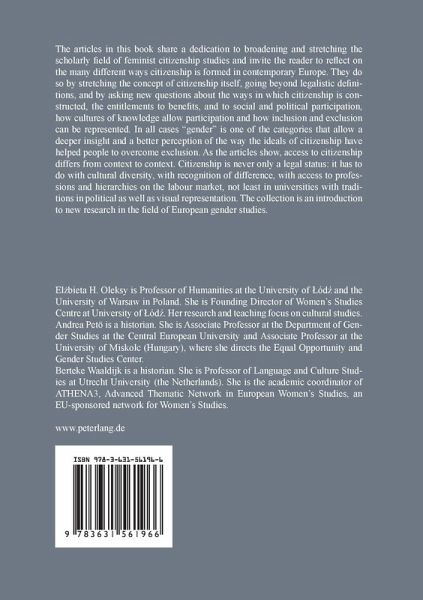 The articles in this book share a dedication to broadening and stretching the scholarly field of feminist citizenship studies and invite the reader to reflect on the many different ways citizenship is formed in contemporary Europe. They do so by stretching the concept of citizenship itself, going beyond legalistic definitions, and by asking new questions about the ways in which citizenship is constructed, the entitlements to benefits, and to social and political participation, how cultures of knowledge allow participation and how inclusion and exclusion can be represented. In all cases "gender" is one of the categories that allow a deeper insight and a better perception of the way the ideals of citizenship have helped people to overcome exclusion. As the articles show, access to citizenship differs from context to context. Citizenship is never only a legal status: it has to do with cultural diversity, with recognition of difference, with access to professions and hierarchies on the labour market, not least in universities with traditions in political as well as visual representation. The collection is an introduction to new research in the field of European gender studies.
