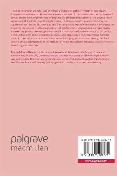 This book examines the remaking of women's citizenship in the aftermath of conflict and international intervention. It develops a feminist critique of consociationalism as the dominant model of post-conflict governance by tracking the gendered implications of the Dayton Peace Agreement. It illustrates how the legitimisation of ethnonationalist power enabled by the agreement has reduced citizenship to an all-encompassing logic of ethnonational belonging and implicitly reproduced its attendant patriarchal gender order. Foregrounding women's diverse experiences, the book reveals gendered ramifications produced at the intersection of conflict, ethno-nationalism and international peacebuilding. Deploying a multidimensional feminist approach centred around women's narratives of belonging, exclusion, and agency, this book offers a critical interrogation of the promises of peace and explores individual/collective efforts to re-imagine citizenship.
