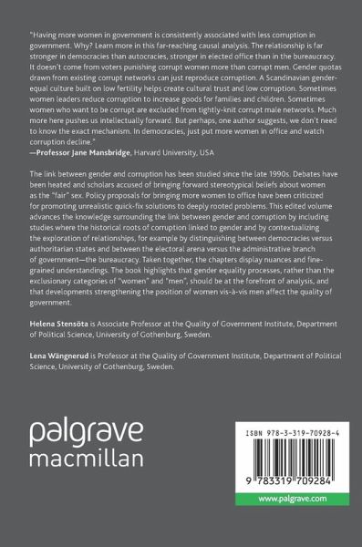 The link between gender and corruption has been studied since the late 1990s. Debates have been heated and scholars accused of bringing forward stereotypical beliefs about women as the "fair" sex. Policy proposals for bringing more women to office have been criticized for promoting unrealistic quick-fix solutions to deeply rooted problems. This edited volume advances the knowledge surrounding the link between gender and corruption by including studies where the historical roots of corruption are linked to gender and by contextualizing the exploration of relationships, for example by distinguishing between democracies versus authoritarian states and between the electoral arena versus the administrative branch of government-the bureaucracy. Taken together, the chapters display nuances and fine-grained understandings. The book highlights that gender equality processes, rather than the exclusionary categories of "women" and "men", should be at the forefront of analysis, and that developments strengthening the position of women vis-à-vis men affect the quality of government.