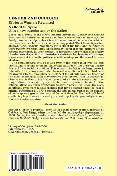 Based on a study of the Israeli kibbutz movement, Gender and Culture discusses the differences in male and female orientations to marriage, the family, and work. Spiro describes the counterrevolution in the kibbutz movement as it evolved over a quarter century period. The kibbutz Spiro first studied, Kiryat Yedidim, was thirty years old at the time, and he returned there twenty-five years later. Spiro initially found that the pioneers of the kibbutz movement, in their attempt to implement their vision of a society based on sexual equality, had created a revolution in the character of marriage, the structure of the family, patterns of child rearing, and the sexual division of labor. The counterrevolution he found twenty-five years later was no less fascinating: a return to certain important features of the prerevolutionary forms of these social institutions. This return to tradition has been the work primarily of the young women who, born and raised in the kibbutz, had been inculcated with the revolutionary ideology of the kibbutz pioneers. Studying the same community after a twenty-five-year interval enables readers to observe the children of the first study as adults in the follow-up study. This longitudinal dimension provides the most important basis for the interpretations offered in Gender and Culture. A new introduction discusses additional, even more radical changes that have occurred since the book's original publication in 1979, situating the kibbutz experience in the context of contemporary gender studies and feminist thought. The book will be of continuing importance for sociologists, anthropologists, psychologists, and women's studies scholars.
