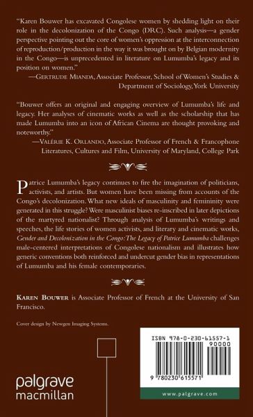Patrice Lumumba s legacy continues to fire the imagination of politicians, activists, and artists. But women have been missing from accounts of the Congo s decolonization. What new ideals of masculinity and femininity were generated in this struggle? Were masculinist biases re-inscribed in later depictions of the martyred nationalist? Through analysis of Lumumba s writings and speeches, the life stories of women activists, and literary and cinematic works, Gender and Decolonization in the Congo: The Legacy of Patrice Lumumba challenges male-centered interpretations of Congolese nationalism and illustrates how generic conventions both reinforced and undercut gender bias in representations of Lumumba and his female contemporaries.