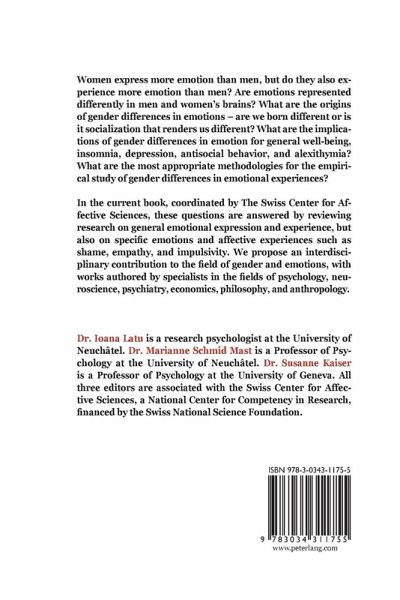 In the current book, coordinated by The Swiss Center for Affective Sciences, these questions are answered by reviewing research on general emotional expression and experience, but also on specific emotions and affective experiences such as shame, empathy, and impulsivity. We propose an interdisciplinary contribution to the field of gender and emotions, with works authored by specialists in the fields of psychology, neuroscience, psychiatry, economics, philosophy, and anthropology.